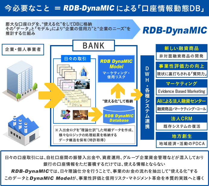 - RDB-DynaMIC はこれらのさまざまな銀行内部の情報に対して「理論仕訳」を駆使し、銀行員の皆さまにとって意義のある新しい情報「動態データベース」を生成します。